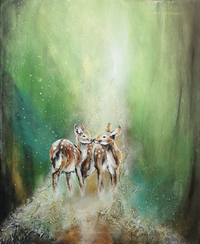 Kuvaus: Peurat, kaunis ja herkkä teos. Teos, jossa on paljon struktuuria ja myös reunat maalattu, valmis ripustettavaksi seinälle.