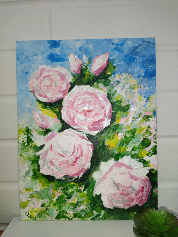 Kuvaus: Hopeanhohtoinen kukkamaalaus kangaspahvipohjalla, signeeraus ja suojalakka. Ilmainen toimitus