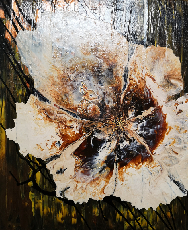Kuvaus: Peura, kukka, juuret, kaunis ja herkkä teos. Canvas, pouring-tekniikka, myös reunat maalattu, teos on valmis ripustettavaksi seinälle.