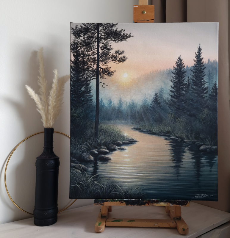 Kuvaus: Akryylimaaleilla canvakselle maalattu teos, reunat siistitty mustalla