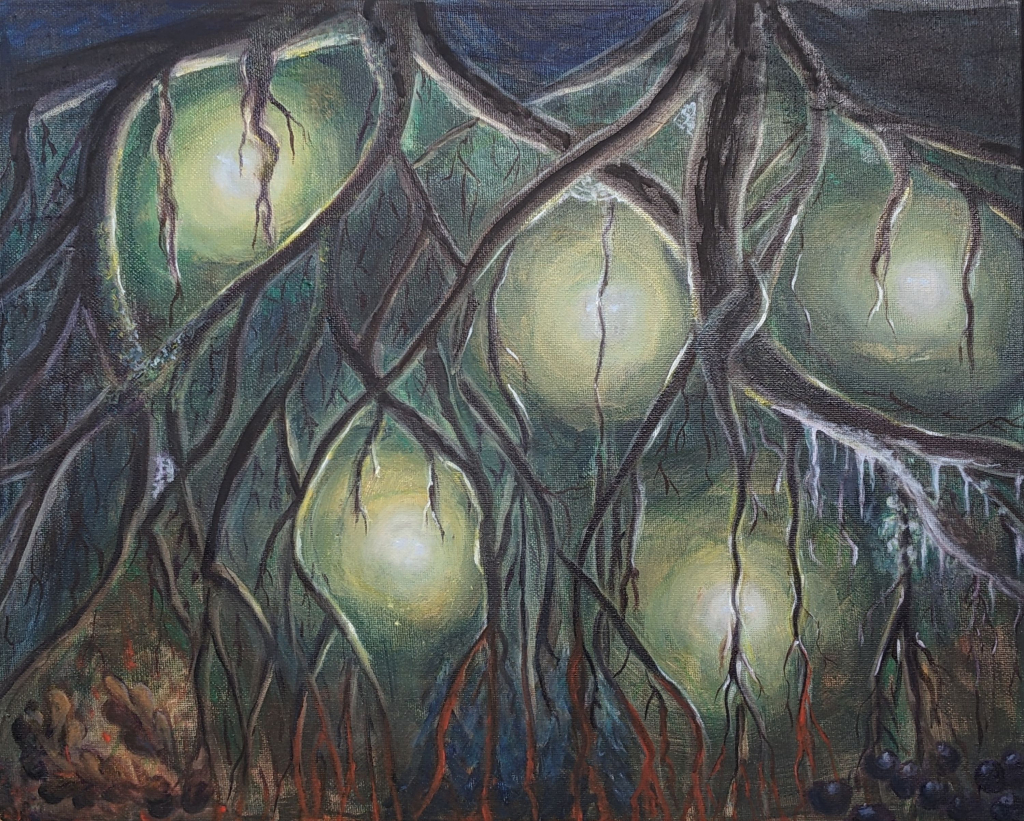 Kuvaus: "Juurtunut" käsittelee kuulumisen tunnetta ja yhteyttä paikkoihin, jotka muovaavat meitä. Kaksi pääjuurta kietoutuvat yhteen ja yhdistyvät. Ne edustavat sitä, miten elämämme kiinnittyy useisiin paikkoihin: maahan, jossa synnyimme, ja maahan, jossa olemme asuneet. Kuten puilla, myös meillä ihmisillä on juuret. Muodostamme juuria kaikkialla, missä asumme ja elämme. Maalauksen valoympyrät edustavat esi-isiä. He valaisevat polkuamme ja auttavat meitä ymmärtämään, mistä tulemme. Vihreät ja keltaiset sävyt viittaavat elämänvoimaan ja kasvuun maan syvyyksistä. Teos on tarkoitettu ihmisille, jotka ovat muuttaneet paikasta toiseen ja/tai kantavat sisällään useita kotimaita. Se on myös niille, jotka etsivät yhteyttä esi-isiinsä ja juuriinsä.