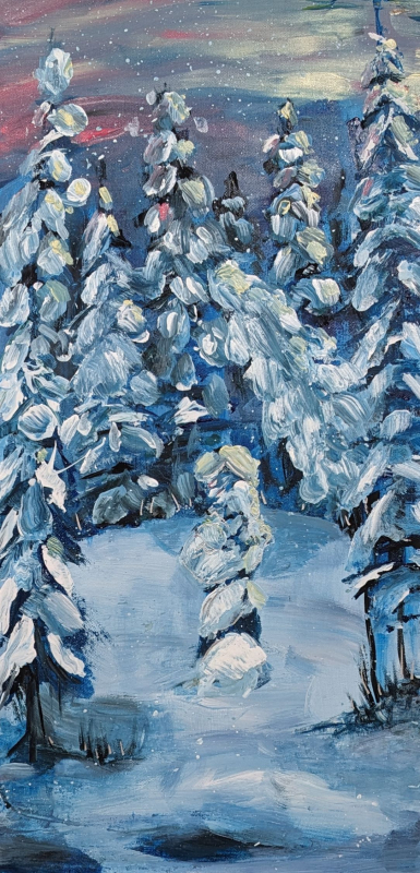 Kuvaus: "Suojassa" näyttää talvisen metsämaiseman, jossa pieni puu seisoo keskellä suurempien puiden ympäröimänä. Pieni puu muistuttaa hahmoa, joka pitää jotain tai jotakuta arvokasta lähellään. Hahmo voisi olla esimerkiksi äiti, joka pitää vauvaa lähellään ja suojaa sitä ympärillä olevalta kylmältä maailmalta. Suuremmat puut muodostavat ympyrän ja kallistuvat lähemmäs joka puolelta. Yksi puu taipuu erityisen lähelle, melkein tunkeillen. Silti pieni puu pysyy keskittyneenä sisäänpäin ja suojaa sitä, mitä se pitelee. Lumi peittää kaiken kylmin sävyin. Se muistuttaa meitä siitä, että maailma voi olla kova ja kylmä. Tämä maalaus puhuu suojelusta ja huolenpidosta vaikeina aikoina. Se on tarkoitettu kaikille, jotka ovat seisseet lujina ja ovat suojelleet jotain tai jotakuta arvokasta, vaikka maailma tuntui kylmältä ja tuomitsevalta.