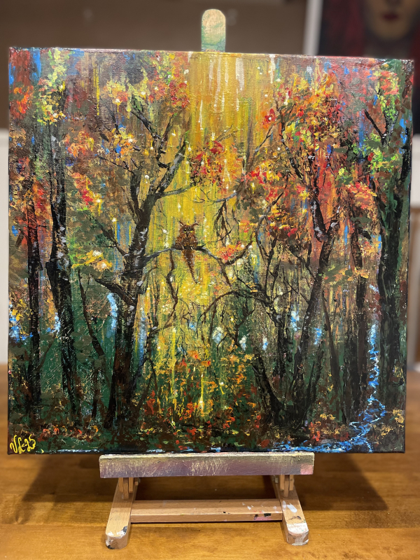 Kuvaus: ”Ei pöllömpi ruska ajatteli optimistinen pöllö, kun syksyn kimalteleva sade kasteli hänen hentoista höyhenpeitettään”