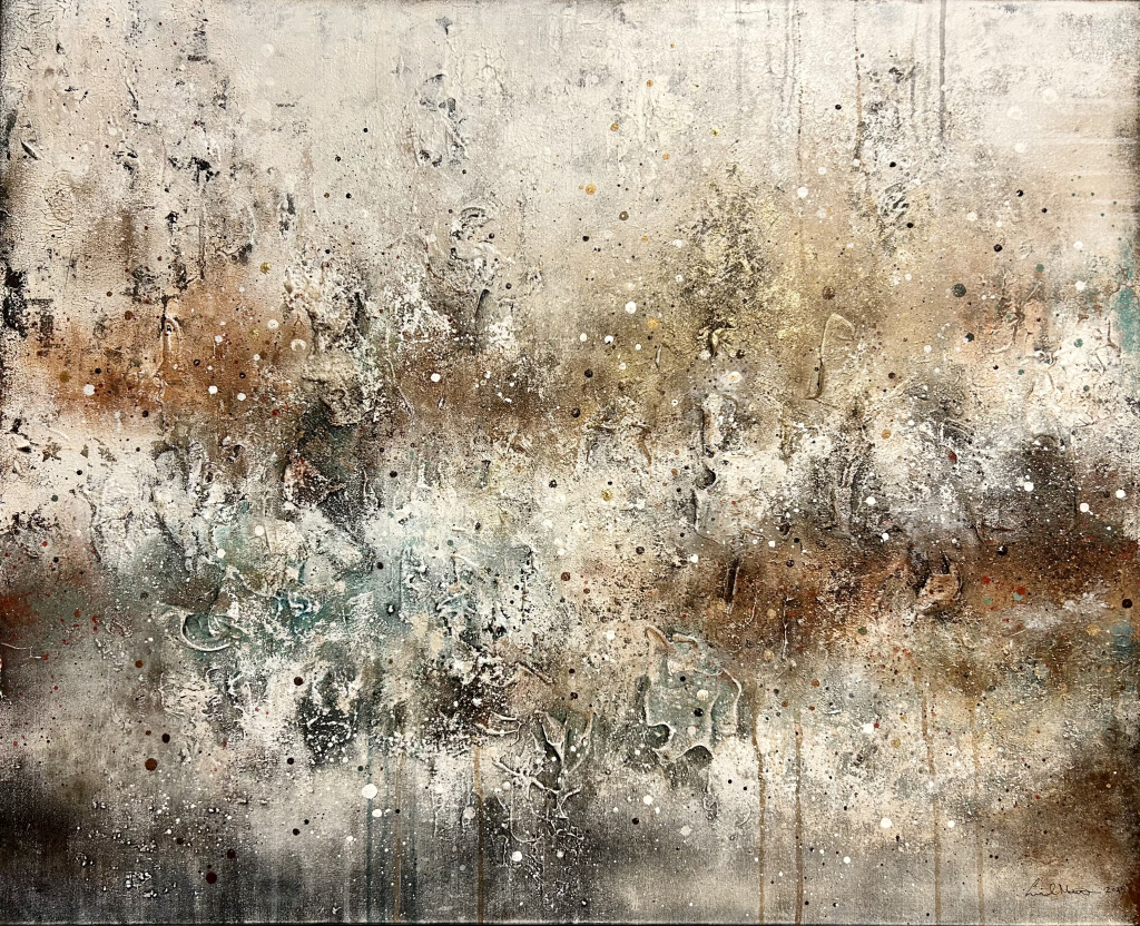 Kuvaus: Rouheva tekstuurinen teos maanläheisillä väreillä ja kullan hohteella.