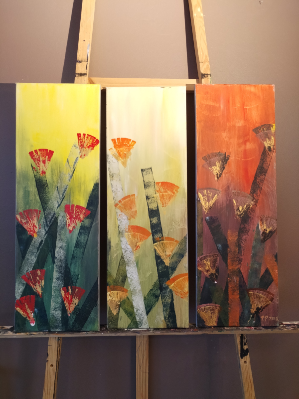 Kuvaus: Kolmiosainen maalaus kukka-aiheella. Sisältää kultamaalia joka kimaltelee kivasti ja tuo kontrastia teokseen.