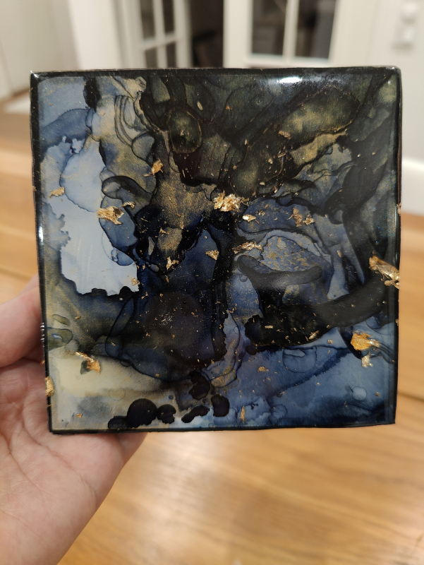 Kuvaus: Pieni alkoholimustemaalaus puuhojalla. Päällä "kultapippuja" ja epoksihartsi