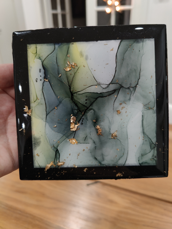 Kuvaus: Pieni alkoholimustemaalaus puuhojalla. Päällä "kultapippuja" ja epoksihartsi