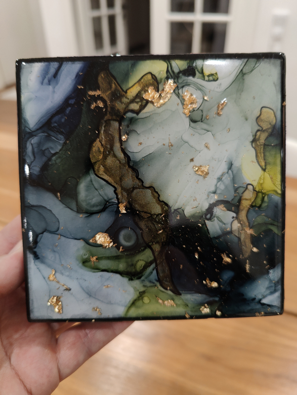 Kuvaus: Pieni alkoholimustemaalaus puuhojalla. Päällä "kultapippuja" ja epoksihartsi