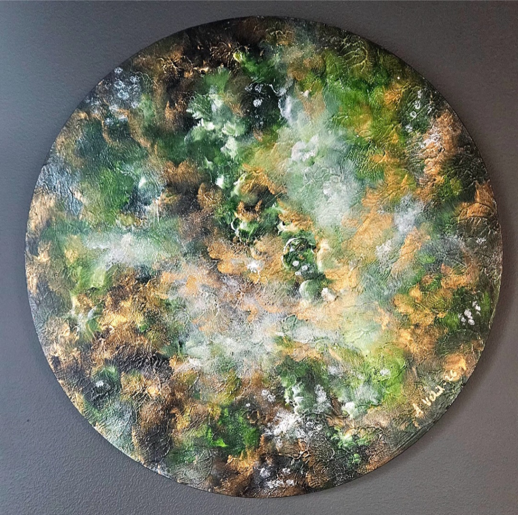 Kuvaus: Pyöreä puuvanerille maalattu teos. Kullan hohtoa