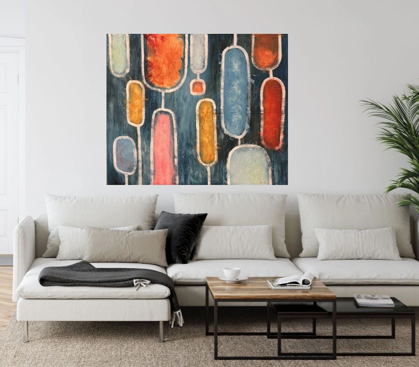 Kuvaus: Abstrakti teos. Mielikuva puutarhan värikkäistä paperilyhdyistä illan viipyilevässä lämmössä. Isoin teokseni kankaalle tähän mennessä. 299 tehtyä teosta. Reunat maalattu, ripustusvalmis. Uniikki sisustustaulu.