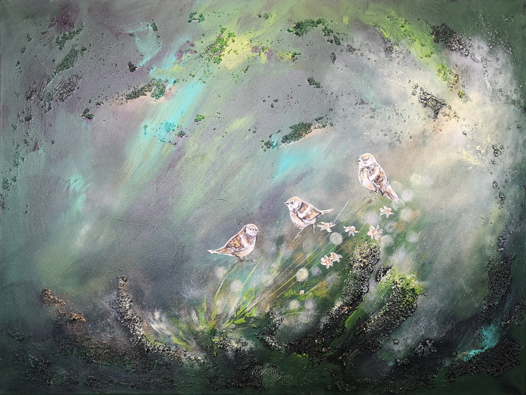 Kuvaus: Linnut, kaunis ja herkkä teos canvasille. Struktuuria ja myös reunat maalattu ja teos on valmis ripustettavaksi seinälle. www.kirsirautiainen.art
