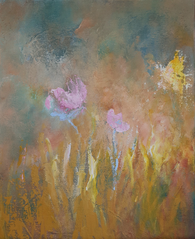 Kuvaus: Abstrakti akryylimaalaus, kukat