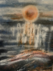 Akvarellini syntyvät sekä pesusienellä ja palettiveitsellä. Akvarellini ovat ilmavia ja vähäeleisiä.