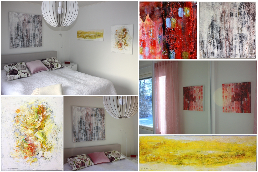 Tämä maalausten sarja pääsi upeaan miljööseen juuri sille sopivalle paikalle. Olen tehnyt tämän tilaustyönä. Maalausten koko on 2x90*90 ja 1x60*90.