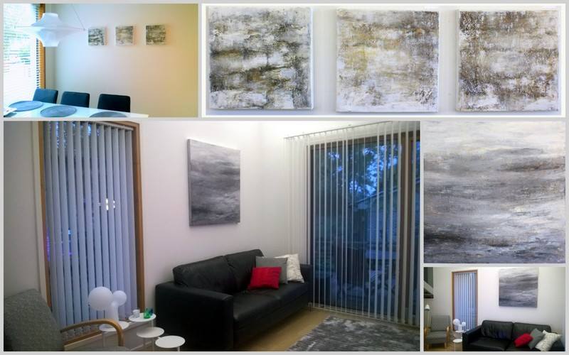 Maalausten "Usva" ja "Lokakuun kutsu 1-3" ovat päässeet kauniiseen kotiin. "Olen erittäin tyytyväinen ostokseeni ja teoksia katsellessa mieli lepää ihanassa luonnon tunnelmassa. Kiitos!"