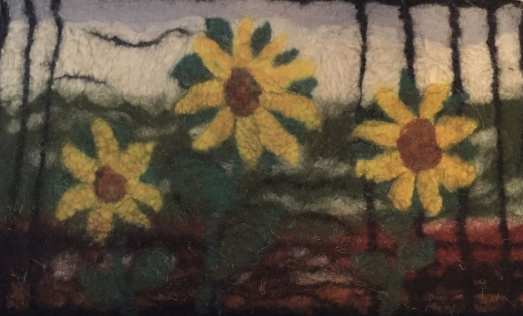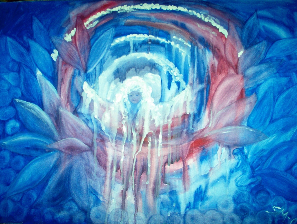 I’m an emotional person and I also sense the presence of the invisible world. Sometimes the invisible becomes visible in my paintings unintentionally. I like to try out different techniques. In addition to painting in acrylics I have done recycled art with patches of felt, fabric and paper. I work through different emotional states and doing so I see the world through coloured filters. Green, blue and purple are very strong in my artwork.
