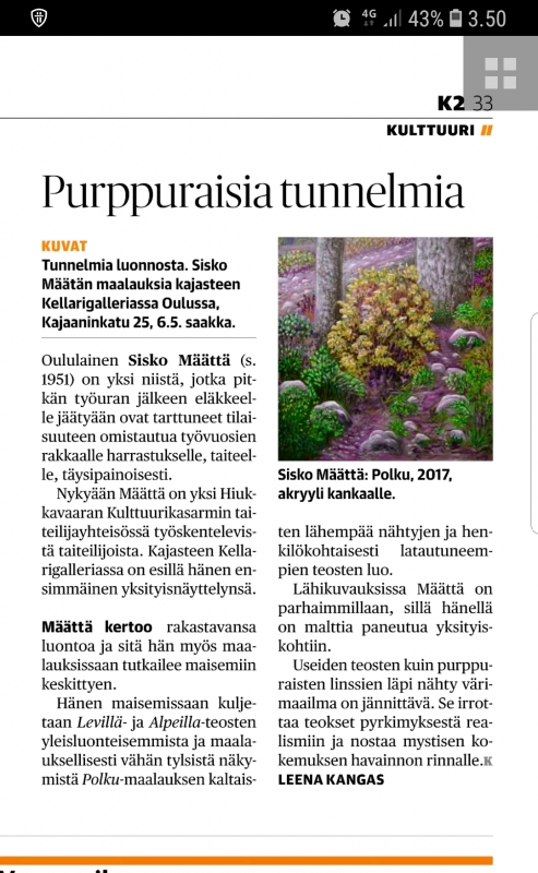 I have had a versatile and multi-professional career elsewhere (as a special designer among other things), but as a carpenter’s daughter art has been a concrete part of my life in drawing and painting. I’m both self-educated and course-trained artist, one of my teachers has been Tauno Ohenoja, a visual artist from Oulu.