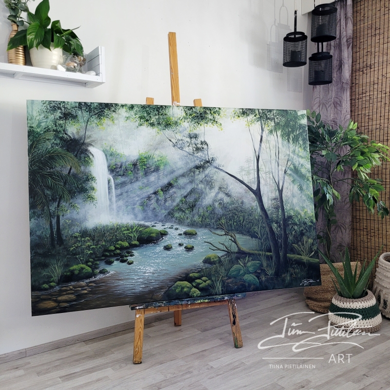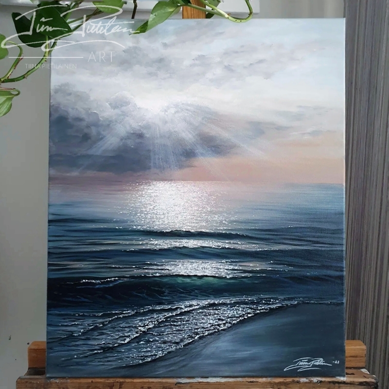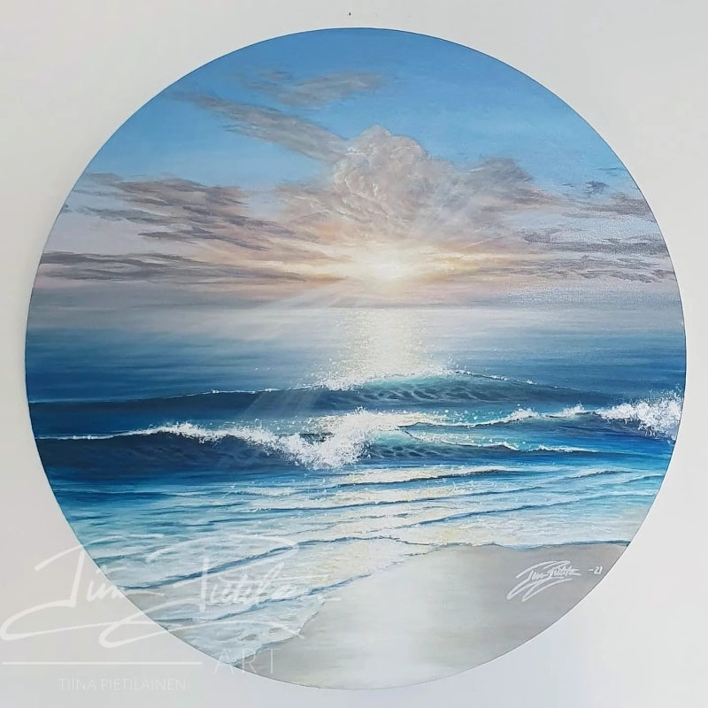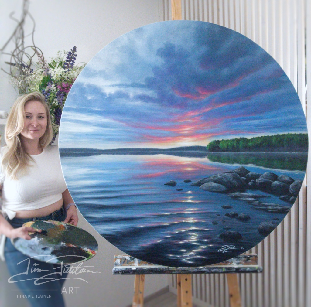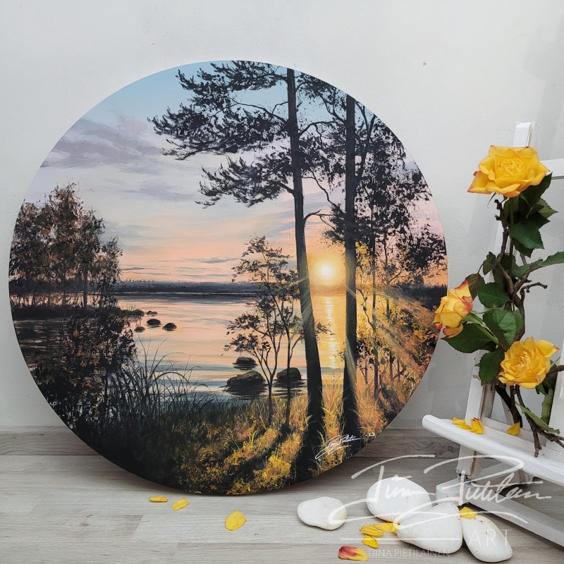 Kuvittele itsesi järven rannalle auringonlaskun aikaan – valonsäteet tanssivat veden pinnalla, metsän vihreys hehkuu ympärilläsi, ja tunnet, kuinka mielesi rauhoittuu. Tätä tunnetta haluan välittää taiteellani. Maalaukseni ovat täynnä luonnon valoa, värejä ja positiivista energiaa, jotka tuovat tilaan kuin tilaan harmoniaa ja lämpöä.