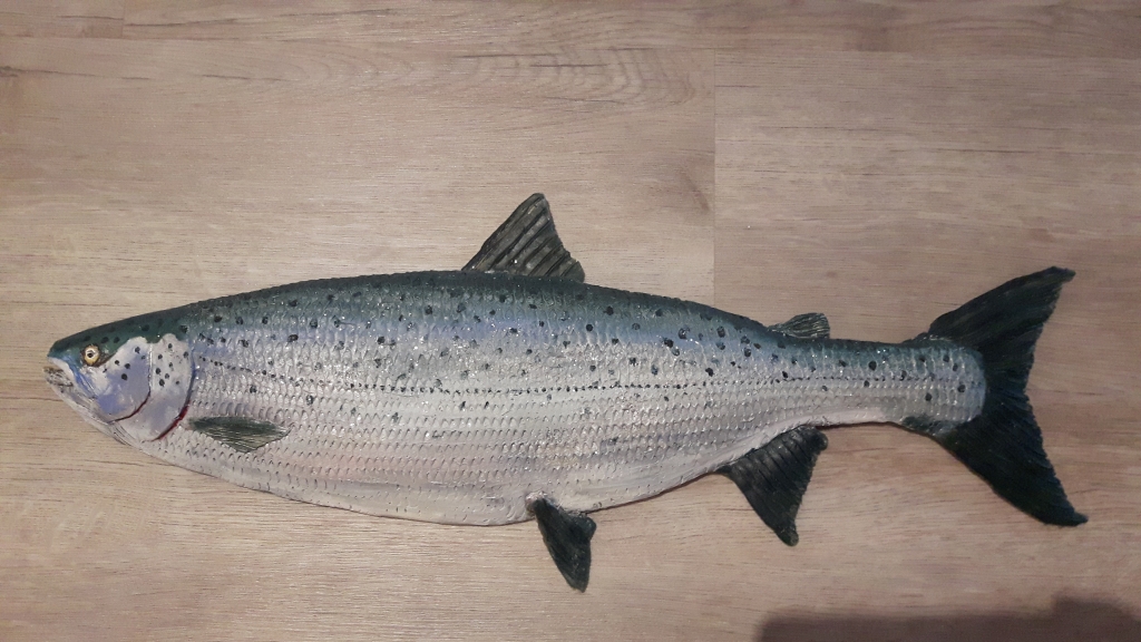 Kuvaus: Veistos hiekka/hartsi seos. Maalattu öljymaalilla. Takana koukut.