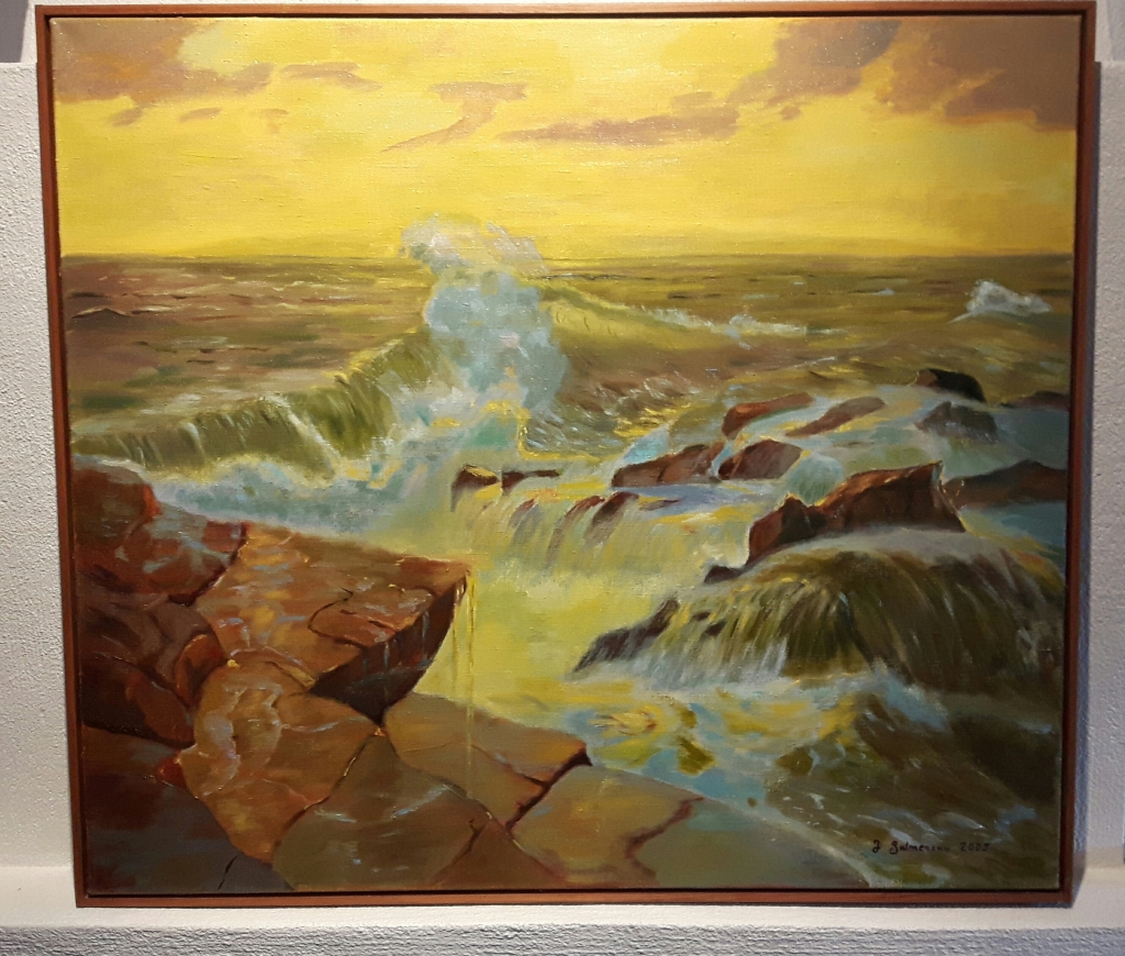 Kuvaus: Kultain hetki rannikolla: Aalto vyöryi kohti rosoista rantaa, ei uhkaavana, vaan voimallisen juhlavana. Kun vesi murtui tummia kallioita vasten, se ei näyttänyt enää vedeltä, vaan valon ja vaahdon tanssilta. Tuuli kantoi mukanaan suolan hajua ja lupauksen lämpimästä yöstä.