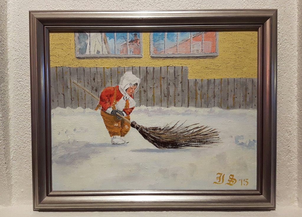 Kuvaus: Pieni luutija on löytänyt liian suuren koivuluudan ja ottanut sen tehtäväkseen. Hän ei välitä lumen painosta tai kylmästä viimasta; hänellä on tärkeä työ tehtävänä. Jokainen veto puhdistaa palan pihamaata ja tekee tilaa talven leikeille. Punainen takki hehkuu valkoista hankea vasten, kuin pieni majakka keskellä talvista pihapiiriä.