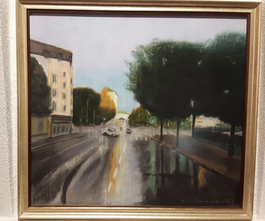 Kuvaus: Lahden Harjukatu.Maalattu koivuvanerille.Mattalasi.