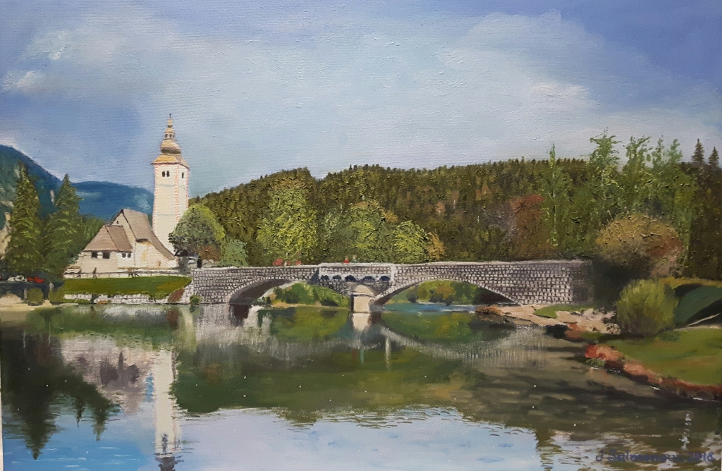 Kuvaus: Maalauksessa aurinko on juuri kultaamassa puiden latvat ja kirkon seinät. Se on hetki, jolloin maailma tuntuu pysähtyvän-kuin luonto itse pidättäisi hengitystään kunnioituksesta. Kirkko seisoo järven rannalla kuin uskollinen vartija, joka muistuttaa meitä siitä, että vaikka maailma muuttuu, on olemassa paikkoja, jossa rauha säilyy ikuisesti.