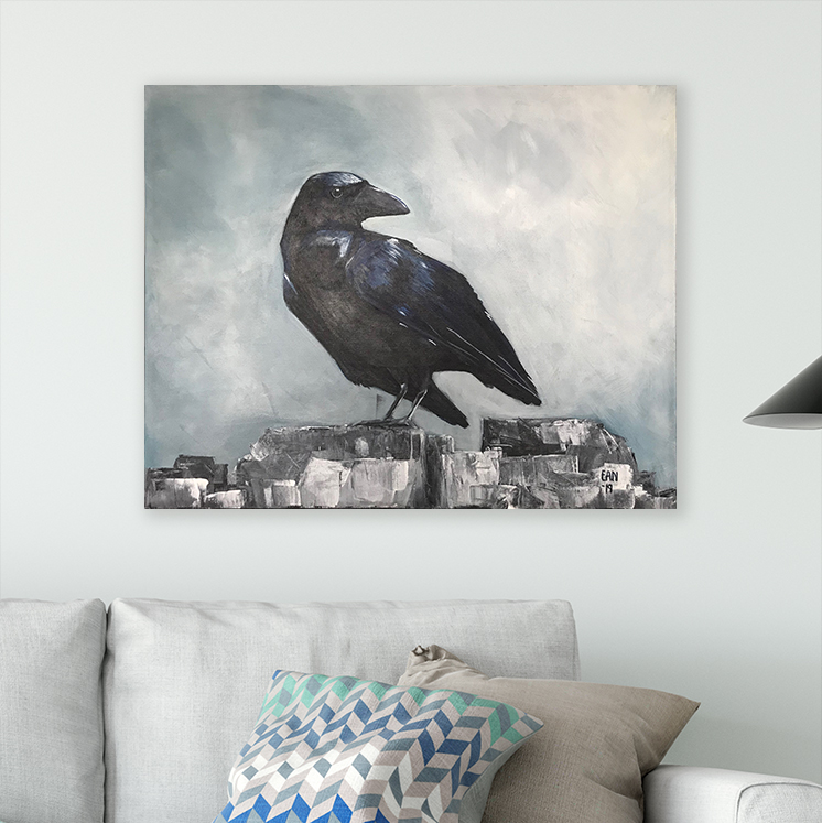 Kuvaus: Muotokuva variksesta. Teoksen reunat on maalattu ja se on ripustusvalmis.