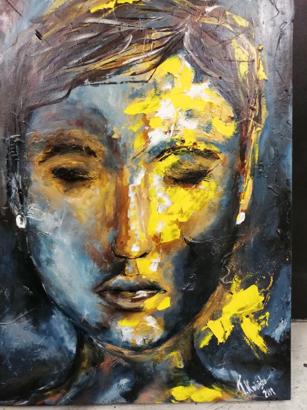 Kuvaus: Akryyleilla tehty sekatekniikalla canvaspohjalle. Ripustusvalmis. Rouhea pinta.