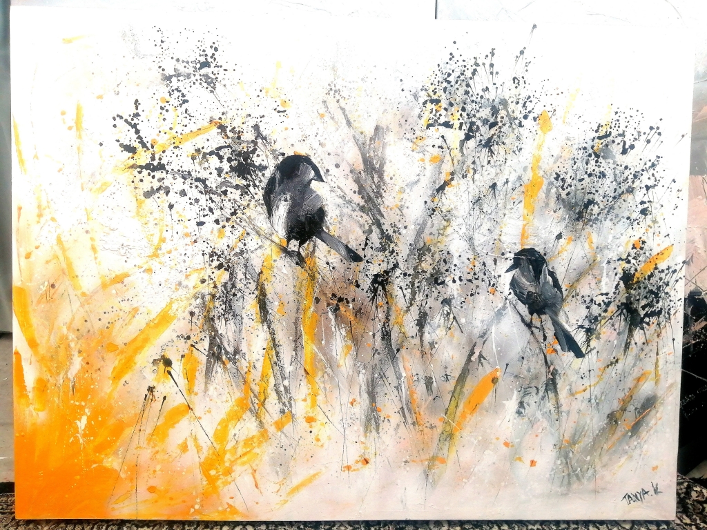 Kuvaus: Akryyleilla tehty sekatekniikalla paksulle canvaspohjalle. Lämmin keltainen, hieman rosoinen elävä pinta. Takana on metallilanka, ripustusvalmis.