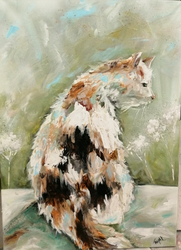 Kuvaus: Akryyleilla tehty sekatekniikalla canvaspohjalle. Ripustusvalmis. Metallilanka takana.