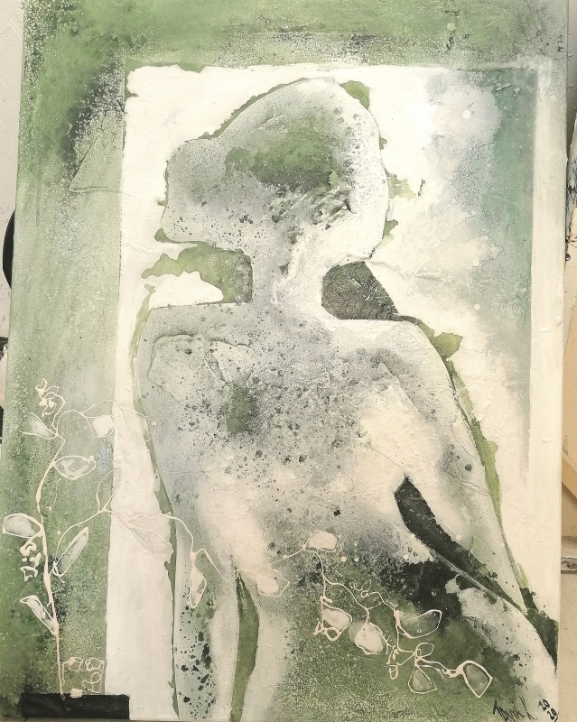Kuvaus: Akryyleilla tehty sekatekniikalla canvaspohjalle. Ripustusvalmis. Takana on metallilanka.