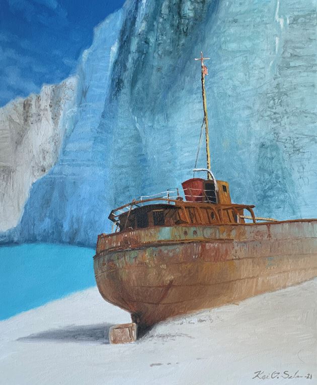 Kuvaus: Turkoosi Välimeri. Hehkuva Kreikan aurinko ja teräksen varjo. Laivan viimeinen leposija luunvalkealla hiekalla. Ylväänä kuin antiikin raunio - tuhannet tarinat vatsassaan. Merimaisema. Kehykset eivät kuulu hintaan. Melko alhaisen hinnan taiteilija toivoo kannustavan ostajaa kehystämään teoksen.