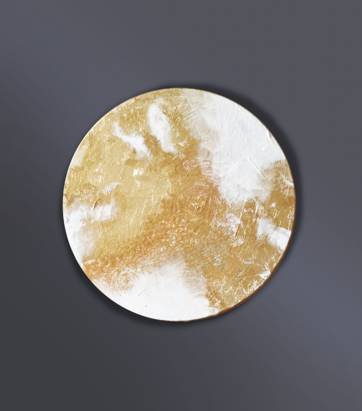 Kuvaus: Akryylimaalaus Kultainen Kuu. Tekniikassa hyödynnetty lehtikultaa. Teoksella on sisar Kultasuoni. Tehty pyöreälle kangaspohjalle, joka halkaisijaltaan 20cm. Teos on näytillä Ronttopuistossa Heinävedellä 1.6.-31.7.2022.