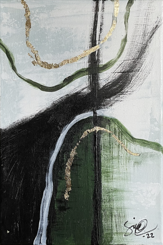 Kuvaus: Akryylimaalaus Puro. Tehty kangaspohjalle, joka on kooltaan 20x30x1cm. Teoksessa hyödynnetty lehtikultaa.