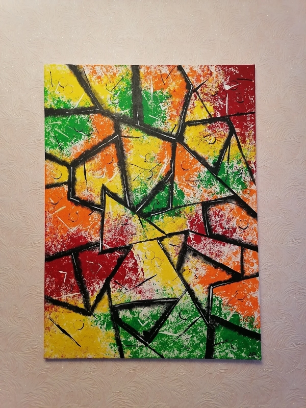 Kuvaus: Viidakon villi väripläjäys. Teos, jonka ohi ei voi kulkea kiinnittämättä teokseen huomiota. Väreillään vangitseva teos, toimii helposti huoneen katseenvangitsijana.