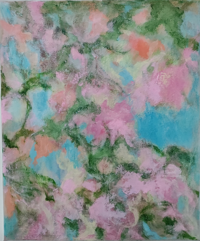 Kuvaus: Värikäs abstrakti näkymä.Ripustusvalmis.Signeeraus takana.