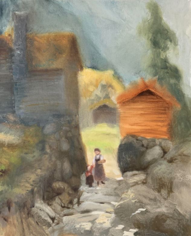 Kuvaus: Figuratiivinen teos. Kesän värejä ja auringon laikkuja. Teos on osakopio Norjan kansallismuseon teoksesta. Mutta niin, että olen tahallani yrittänyt pidättäytyä liiallisesta tarkkuudesta. Tehokeino syvyyden saamisessa muihin teoksiin. Sivut voin maalata, jolloin ripustusvalmis vaikkapa lastenhuoneeseen.