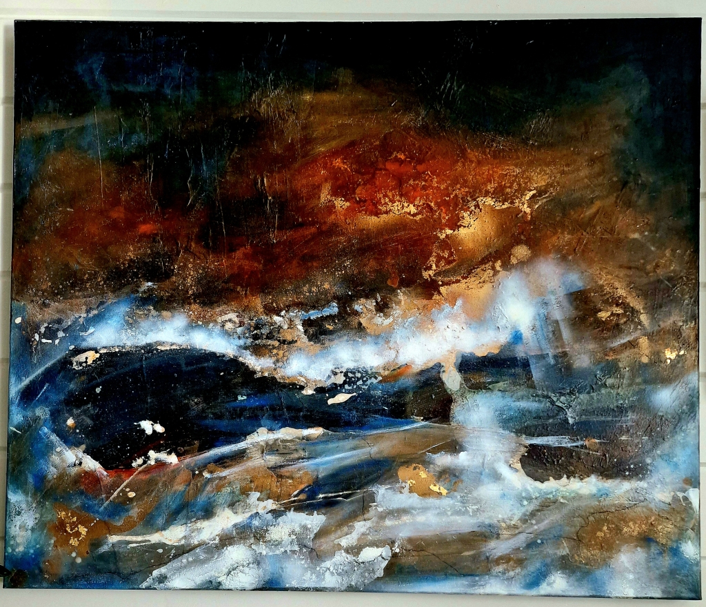 Kuvaus: Akryyleilla tehty sekatekniikalla paksulle canvaspohjalle. Ripustusvalmis. Takana on metallilanka.