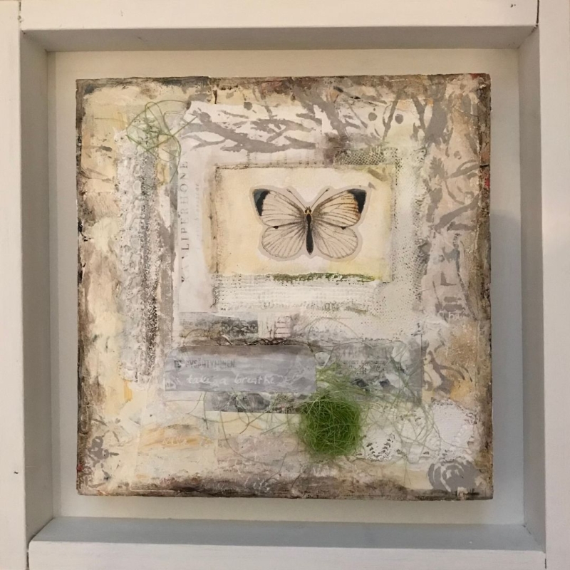 Kuvaus: Puupaneelille maalattu mixed media teos. Kehystetty puukehyksiin, mitat ovat kehysten mitat. Teos kehysten sisällä on 25x25 cm