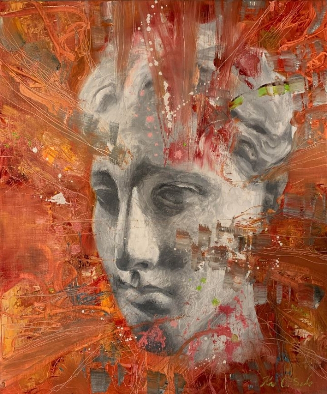 Kuvaus: Abstraktin ja esittävän synteesi. Naispatsaan pää ja villi abstrakti tausta. Mitä me muistamme ja mitä meistä jää muille? Reunat maalattu, ripustusvalmis. Uniikki sisustustaulu.