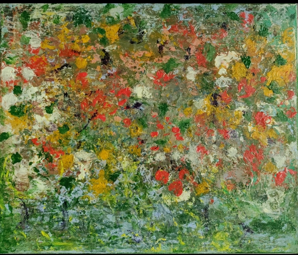 Kuvaus: Värikäs abstrakti näkymä.Ripustusvalmis.Teos on monesta suunnasta katsottava.Signeeraus takana.