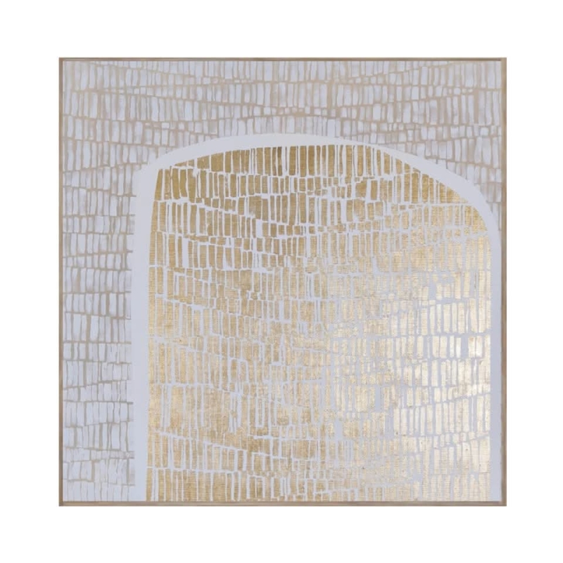 Kuvaus: Akryyli ja lyöntimetallikulta raakapellavalle, joka jätetty näkyviin reunoille takana rautalanka ripustus
