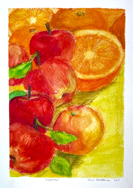 Kuvaus: Akvarelliliiduilla toteutettu asetelma-maalaus akvarellipaperille.