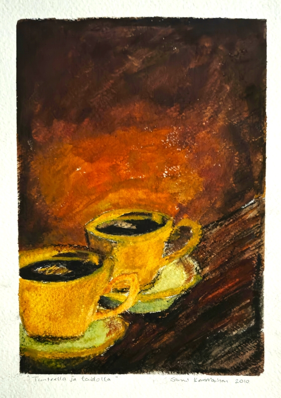 Kuvaus: Vanha teos, jonka täsmällistä tekniikkaa en muista ja osaa varmuudella arvioida, mutta luultavasti akvarelli-hiili -sekatekniikalla toteutettu teos akvarellipaperille.