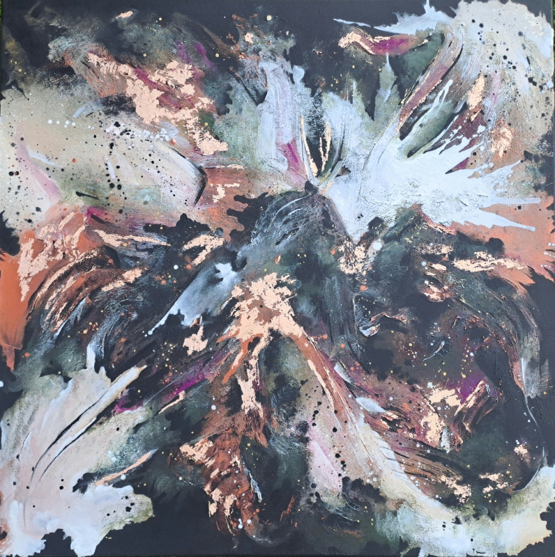 Kuvaus: Akryylimaalaus,lehtipronssi,struktuuri pohjalla