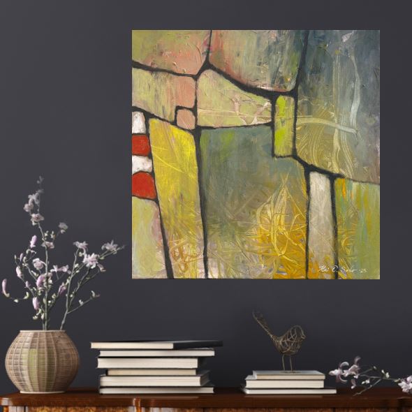 Kuvaus: Abstrakti teos. Vihreä ja sitten kuitenkaan ei. Reunat maalattu, ripustusvalmis. Uniikki sisustustaulu.