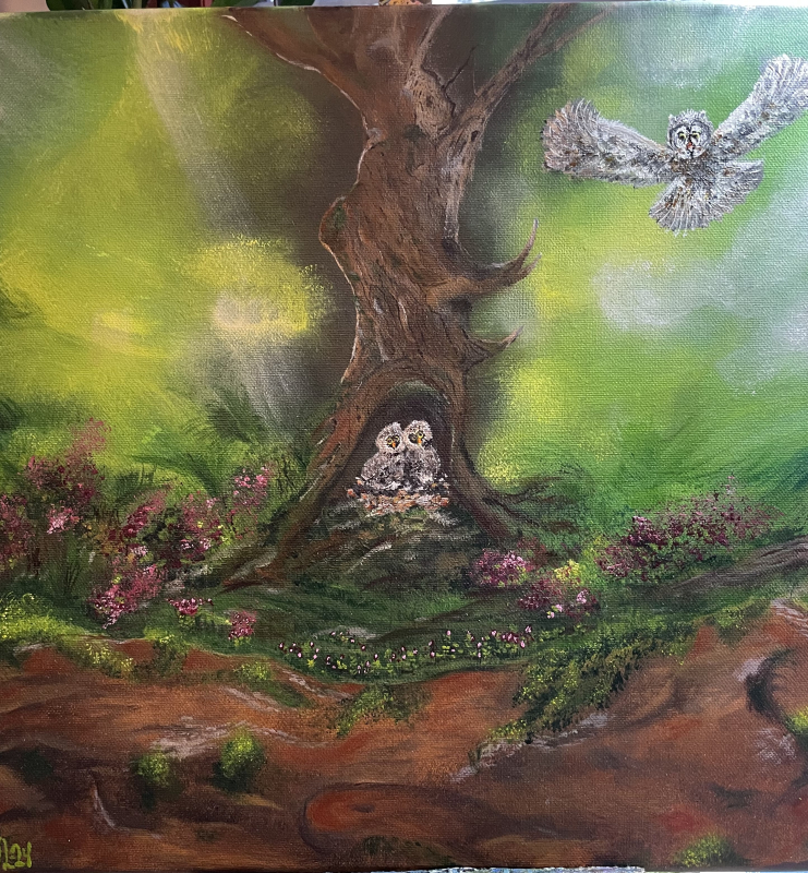 Kuvaus: Pöllöemo lentämässä poikastensa luokse puunkololle. Tunturikanervat somistavat kotikoloa.