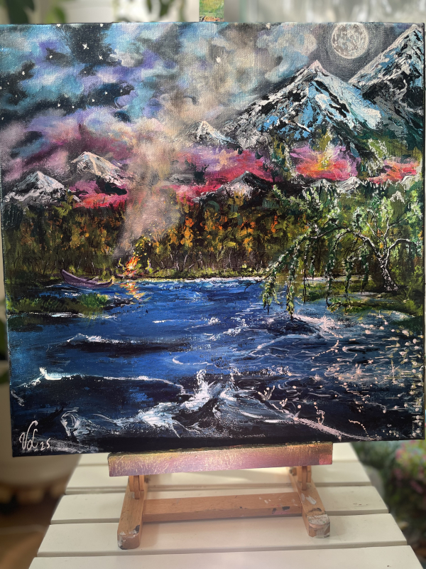 Kuvaus: Täysikuu. Veneilijät ovat laittaneet tulet tunturiin syömisen toivossa. Vene on vedetty rantaan, ehkä yövytään täällä.
