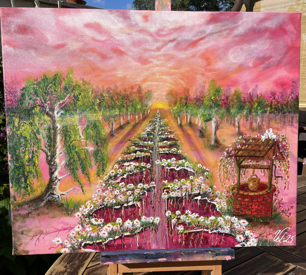Kuvaus: Murtunut maa, äitimaa. Kukat, rauhankyyhkyt ja toivonkaivo, vielä on toivoa, vielä on rakkautta